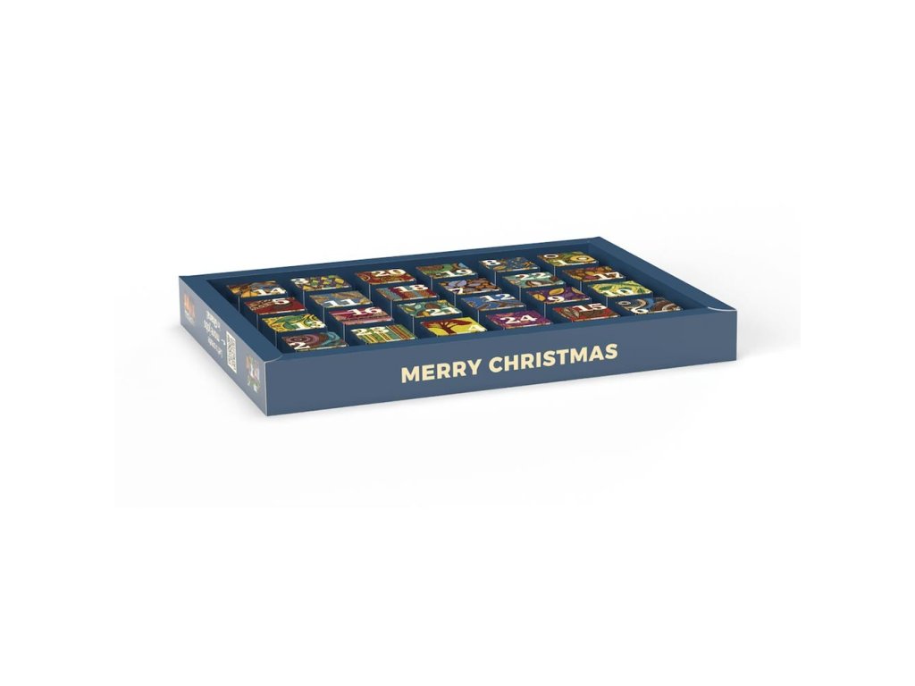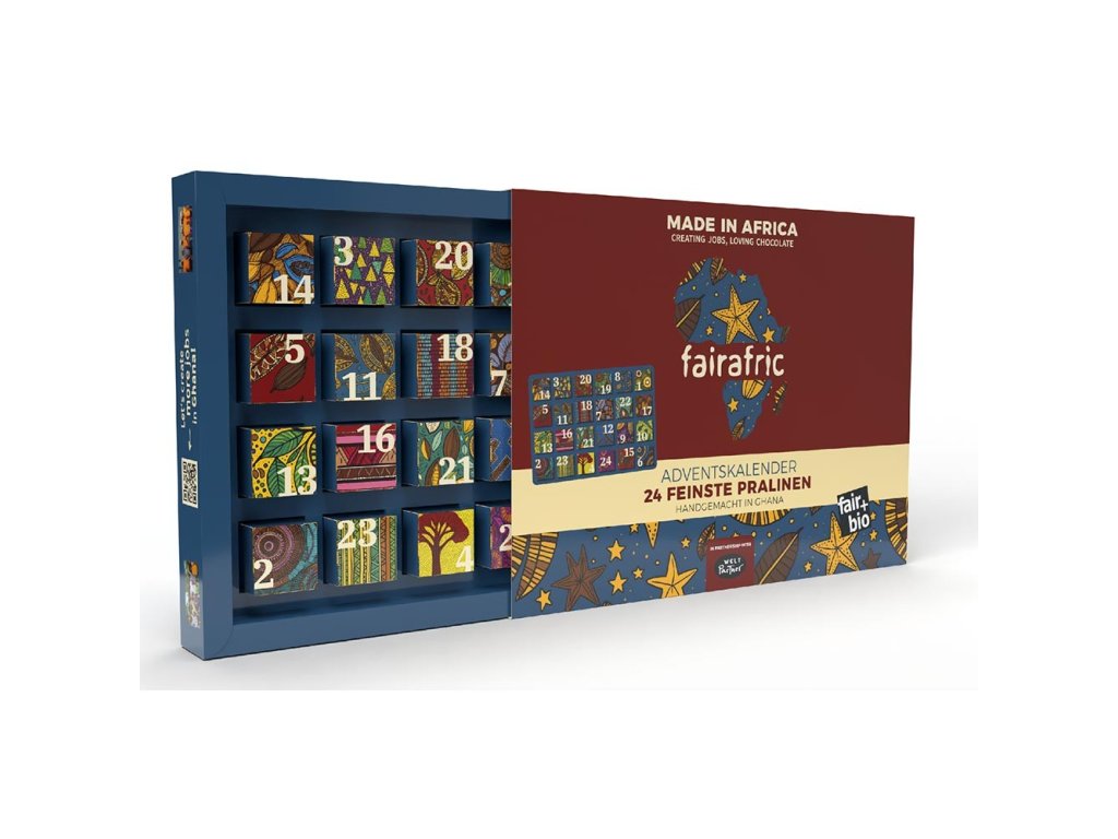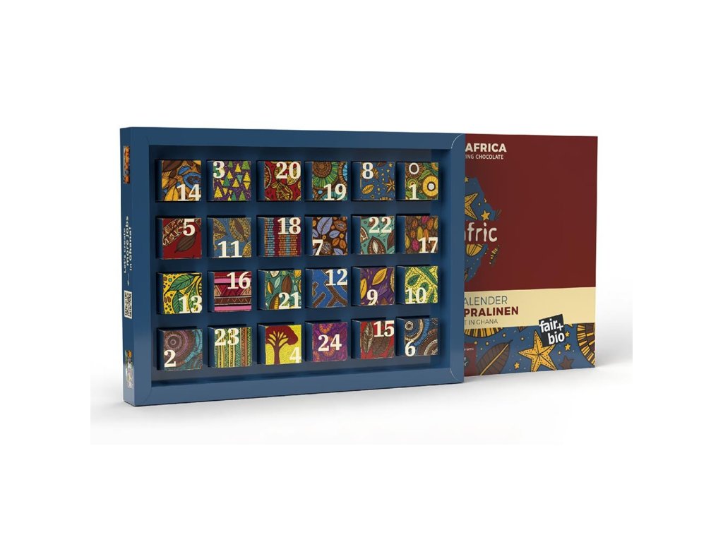 BIO adventní kalendář fairafric, 4x6 druhů pralinek, vegan 240g - vánoční edice